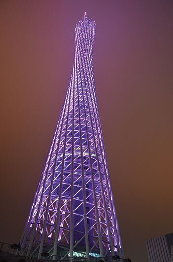Башня в Гуанчжоу построена из стальных труб. Самые крупные из них имеют диаметр 4 метра.